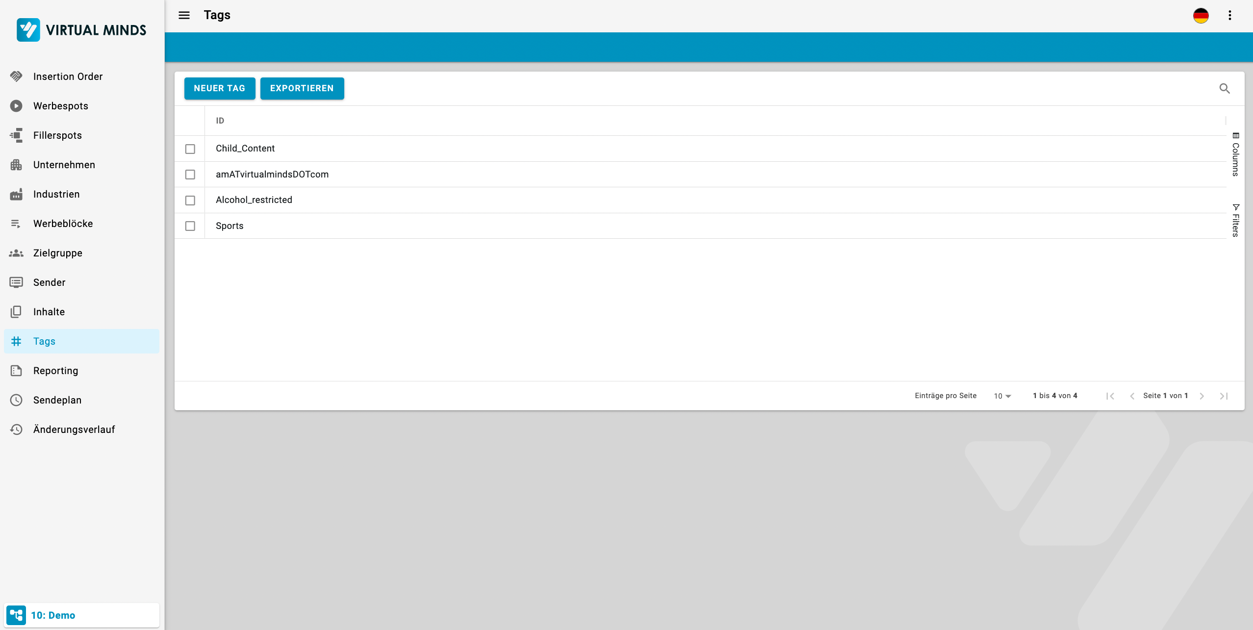 Tags sind frei definierbare Attribute, die sie sowohl Werbeblöcken, als auch Werbespots zuordnen können. Haben Werbeblock und Werbespot den gleichen Tag hinterlegt, so schließen sie sich gegenseitig aus. Ein Werbespot wird vom Media Manager also niemals in einem Werbeblock mit gleichem Tag platziert.