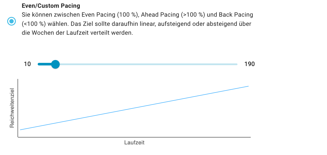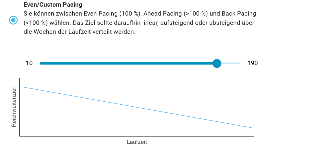 Erlaubt Ihnen, eine gleichmäßige, vorzeitige oder verzögerte Auslieferung einzustellen. Nutzen Sie den Schieberegler, um den Wert des Pacings zu definieren. Der Graph zeigt Ihnen exemplarisch das entsprechende Auslieferungsverhalten im Verhältnis zur Laufzeit. Das Pacing bezieht sich immer auf die Kalenderwochen der Laufzeit.