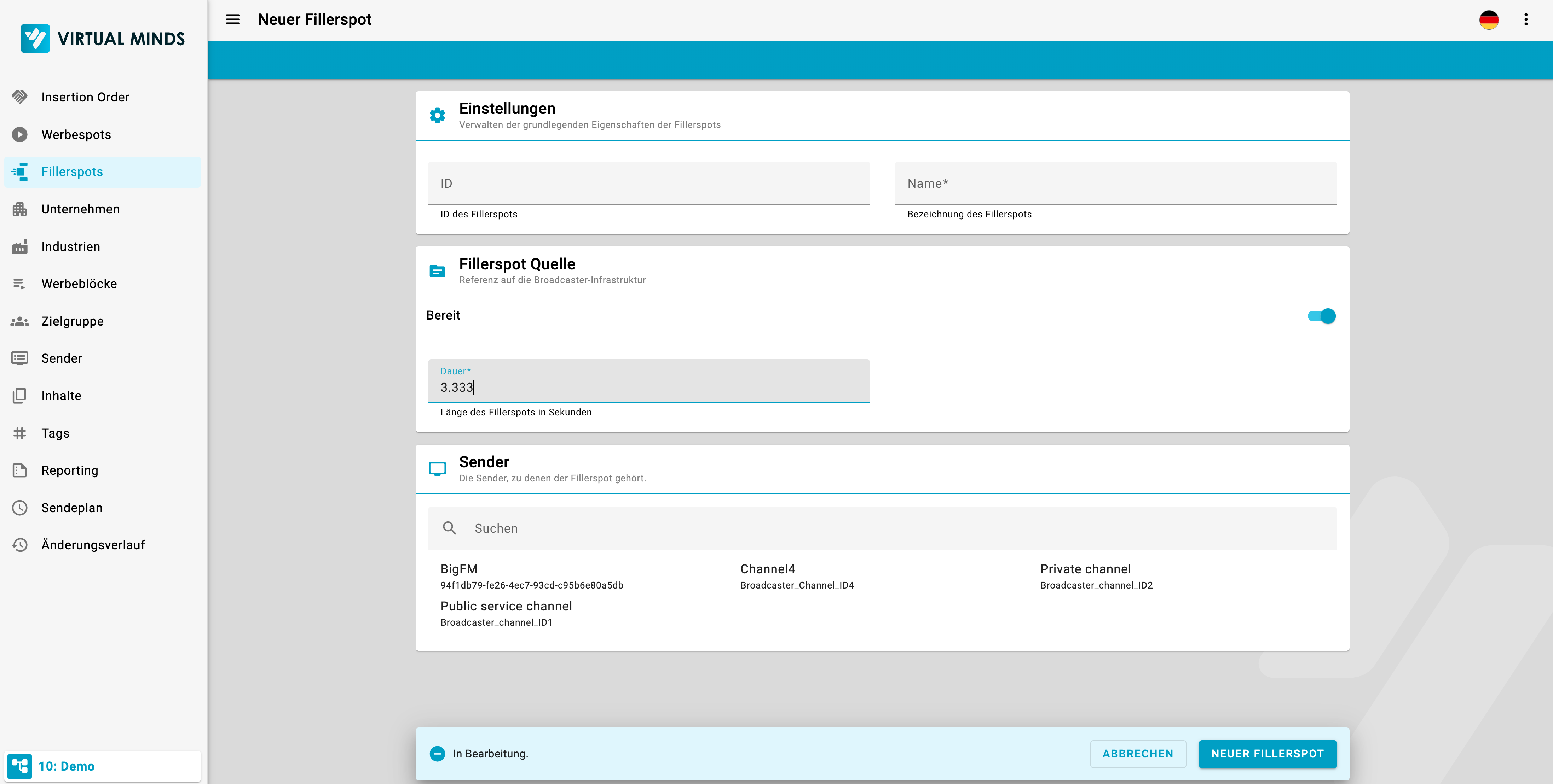 Klicken Sie auf “Neuer Fillerspot”, um einen neuen Fillerspot anzulegen. Im darauffolgenden Fenster können Sie sämtliche Einstellungen zur Anlage des Fillerspots vornehmen.