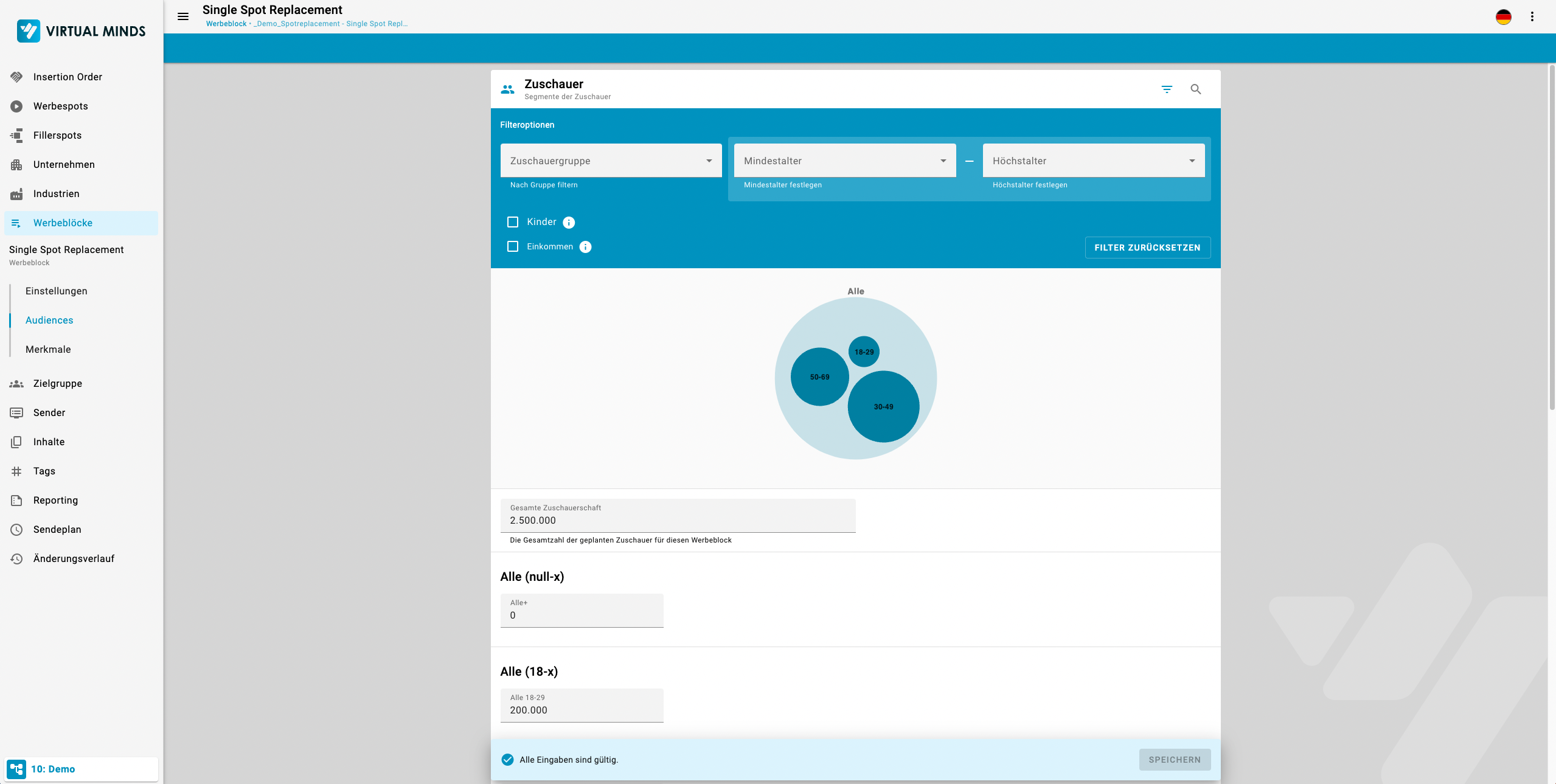 Unter dem Menüpunkt Zielgruppen können Sie die erwartete Zuschauerschaft des Werbeblocks angeben. Neben der gesamten Zuschauerschaft können Sie Reichweiten für alle bisher angelegten Zielgruppen angeben. Mehr Information zur Verwaltung von Zielgruppen erhalten Sie unter 8. Zielgruppen.
