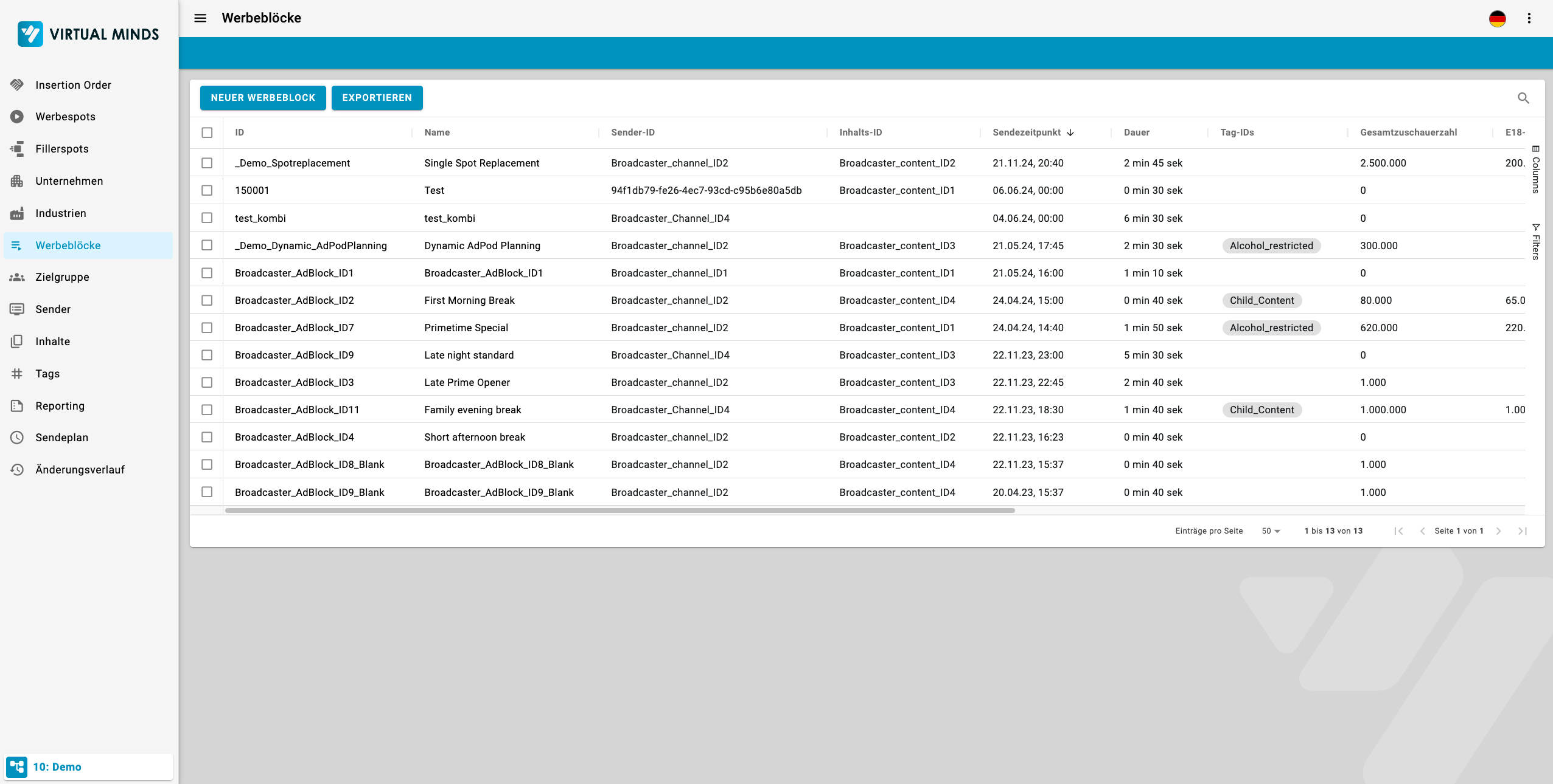 Der Menüpunkt erlaubt Ihnen die Verwaltung Ihrer Werbeblöcke im Virtual Minds Media Manager. Ein Werbeblock entspricht einer Werbepause / Werbeinsel im linearen Signal eines Senders des Broadcasters.